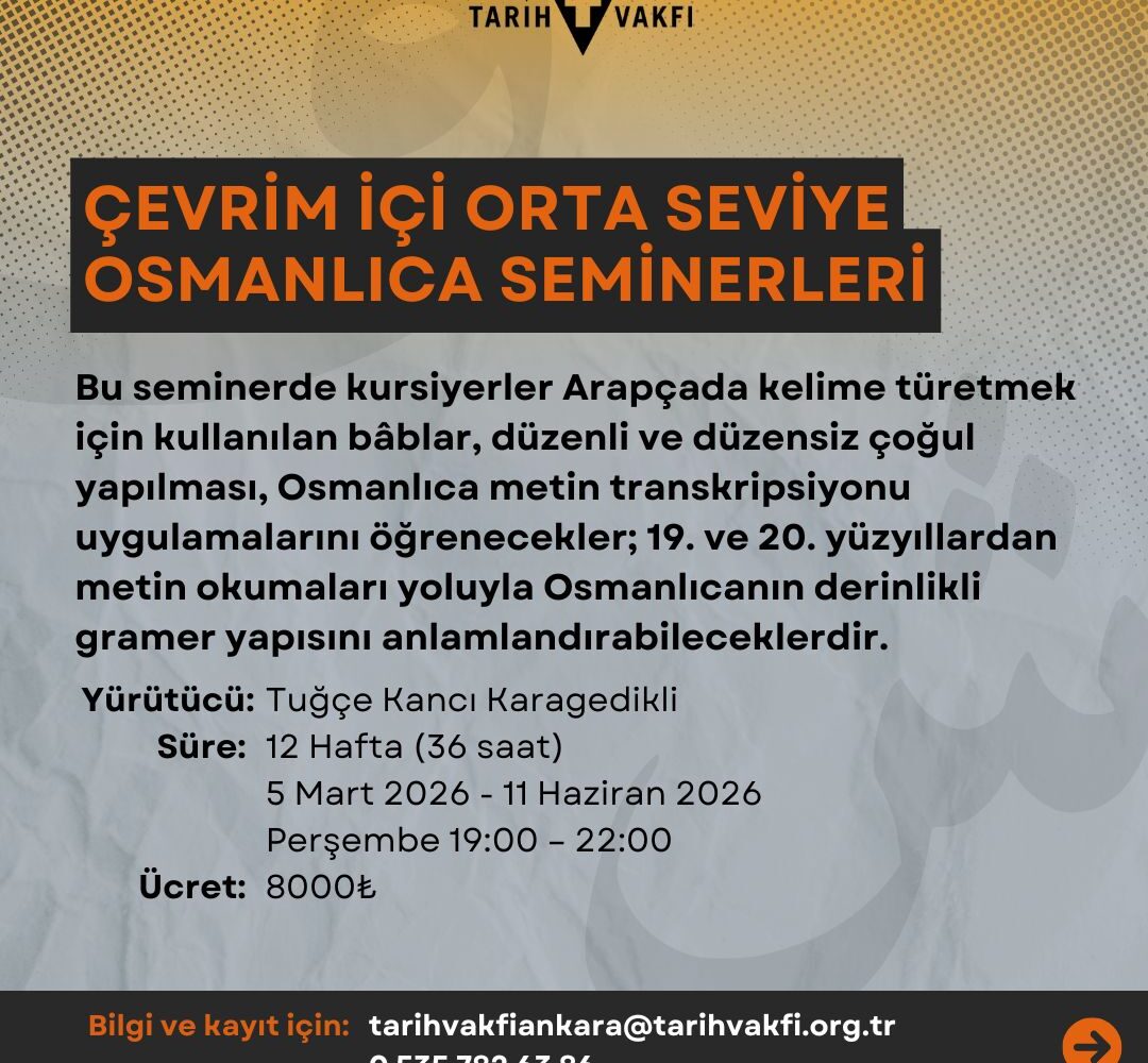 Çevrim İçi Orta Seviye Osmanlıca Seminerleri: Yürütücü: N. Işık Demirakın Süre: 12 Hafta Tarih: 5 Mart 2026 – 11 Haziran 2026 Perşembe 19:00 – 22:00 Toplam Ücret: 8.000 TL Kontenjan: 20 Öğrencilere %50 İndirimli Kontenjan: 5 (tarihvakfiankara@tarihvakfi.org.tr adresine e-posta ile başvurulması gerekmektedir) Kayıt Linki: https://fonzip.com/tarihvakfi/etkinlikler/cevrim-ici-orta-seviye-osmanlica-seminerleri