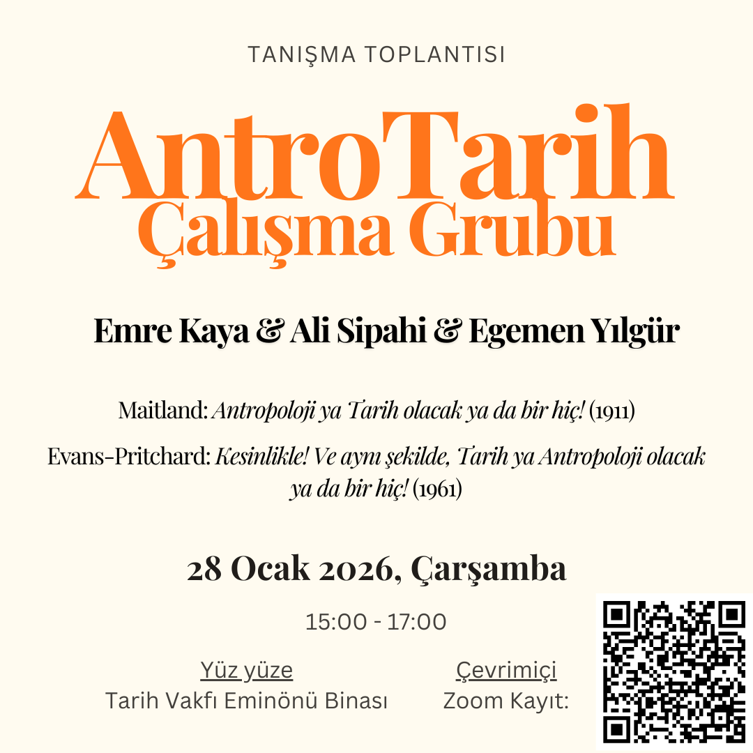 AntroTarih Çalışma Grubu, antropoloji ve tarihi, her iki disiplinin kavramsal derinliğinin hakkını vererek konuşturmanın imkânlarını tartışmak isteyenler için bir platform olmayı amaçlıyor. Her türlü toplumsal anlayış biçiminin – yani kültürün – tarihsel olduğunu bildiğimiz kadar her türlü tarihsellik anlayışının da kültürel olduğunu teslim ediyoruz. İki disiplinin de başka dünyalara, başka zamansallıklara, başka tahayyüllere kapı araladığına inanıyoruz. Bu amaçla, hem güncel antrotarih çalışmalarını hem de kavramsal öncüllerini kolektif olarak tartışmayı ve alanın özneleriyle ilişkilenmeyi amaçlıyoruz. Arşiv etnografisi, tarihsellik rejimleri, mikrotarih, gündelik hayatın tarihi, tarihsel antropoloji, zaman algısı etnografisi, kültürel miras çalışmaları, tarihçilik ritüelleri, antropoloji tarihi ve daha bir çok odak noktası olan bu çok-disiplinli hamurun yoğrulması için gönüllü katılımcıları mutfağa davet ediyoruz.