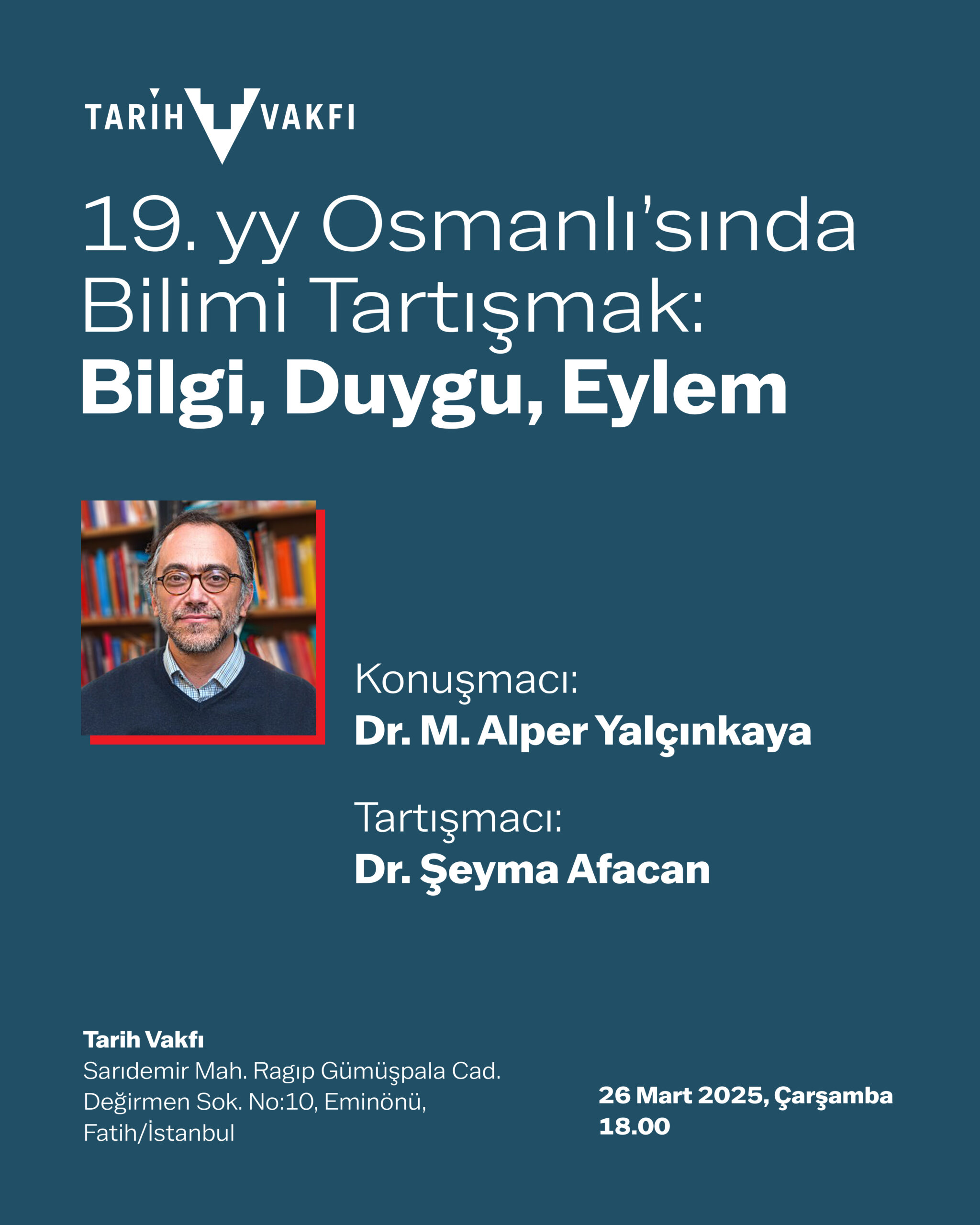 Tarih Vakfı’nda 26 Mart 2025, çarşamba günü saat 18:00’de Mehmet Alper Yalçınkaya’yı “19. yy Osmanlı’sında Bilimi Tartışmak: Bilgi, Duygu, Eylem” başlıklı konuşması için ağırlayacağız.