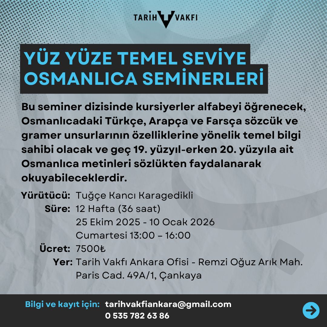 Yürütücü: Tuğçe Kancı Karagedikli Süre: 12 Hafta Tarih: 25 Ekim 2025 - 10 Ocak 2026 Cumartesi 13:00 - 16:00 Toplam Ücret: 7500 TL Kontenjan: 20 Öğrencilere %50 İndirimli Kontenjan: 5 (tarihvakfiankara@gmail.com adresine e-posta ile başvurulması gerekmektedir) Yer: Tarih Vakfı Ankara Ofisi - Remzi Oğuz Arık Mah. Paris Cad. 49A/1 Çankaya Kayıt Linki: https://fonzip.com/tarihvakfi/etkinlikler/1-yuz-yuze-temel-seviye-osmanlica-seminerleri
