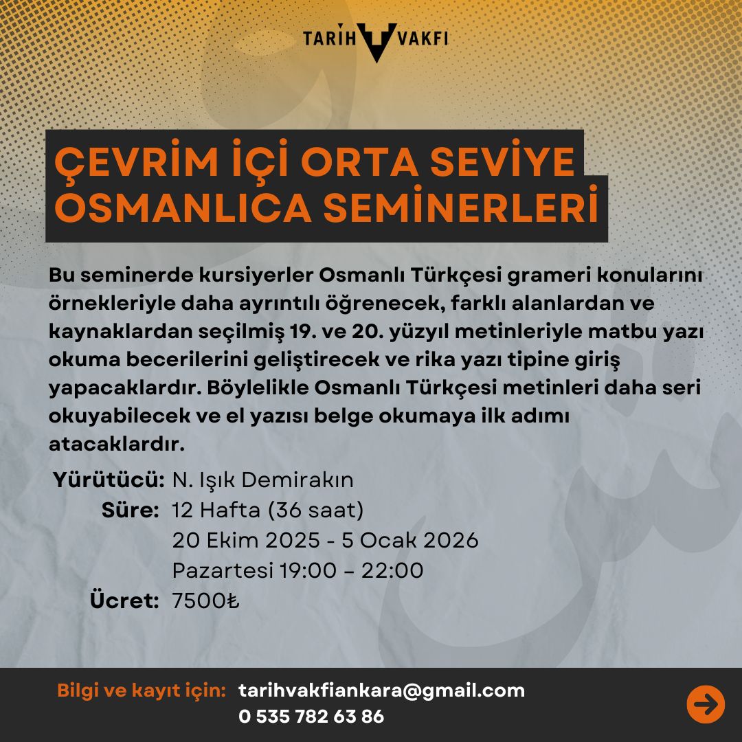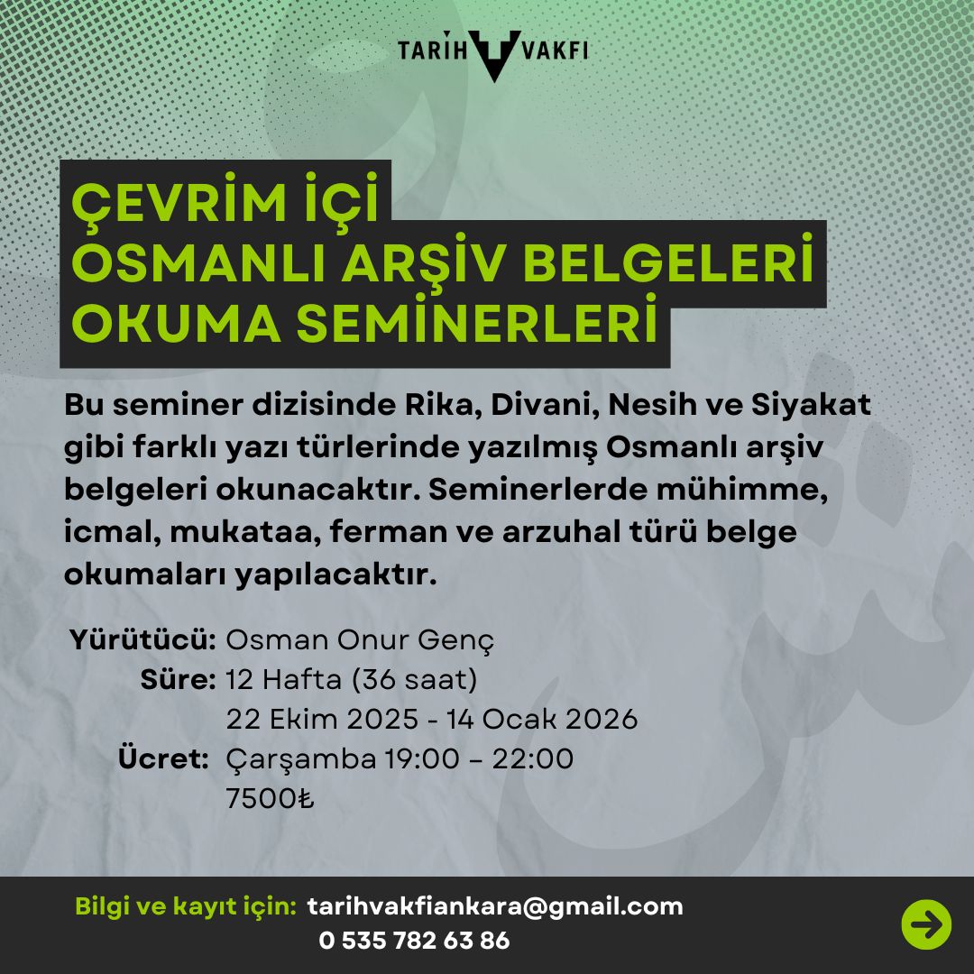 Yürütücü: Osman Onur Genç Süre: 12 Hafta Tarih: 22 Ekim 2025 - 14 Ocak 2026 Pazartesi 19:00 - 22:00 Toplam Ücret: 7500 TL Kontenjan: 20 Öğrencilere %50 İndirimli Kontenjan: 5 (tarihvakfiankara@gmail.com adresine e-posta ile başvurulması gerekmektedir) Kayıt linki: https://fonzip.com/tarihvakfi/etkinlikler/4-cevrim-ici-osmanli-arsiv-belgeleri-okuma-seminerleri