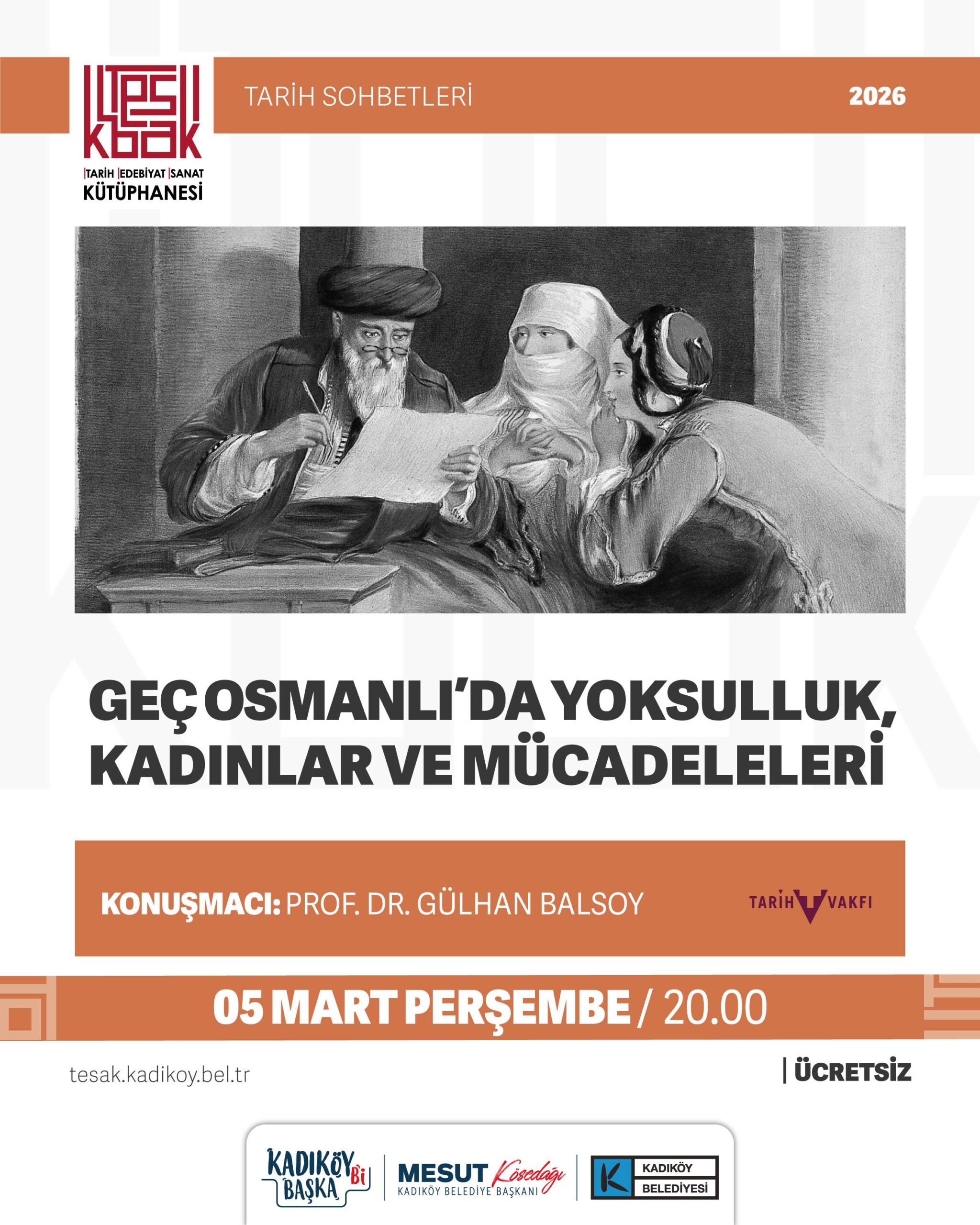 Tarih Vakfı ve TESAK’ın ortaklaşa düzenlediği Tarih Sohbetlerinde her ay bir tarihçimiz yurttaşlar ile buluşuyor. Tarih Sohbetlerinin üçüncü konuşmacısı Prof. Dr. Gülhan Balsoy “Geç Osmanlı’da Yoksulluk, Kadınlar ve Mücadeleleri” başlığıyla bir konuşma yapacak. Bekleriz! Etkinlik bilgileri: Tarih: 5 Mart 2026 Saat: 20:00 Mekan: Tarih, Edebiyat ve Sanat Kütüphanesi Konferans Salonu Caferağa Mahallesi, Rıhtım Caddesi, No: […]