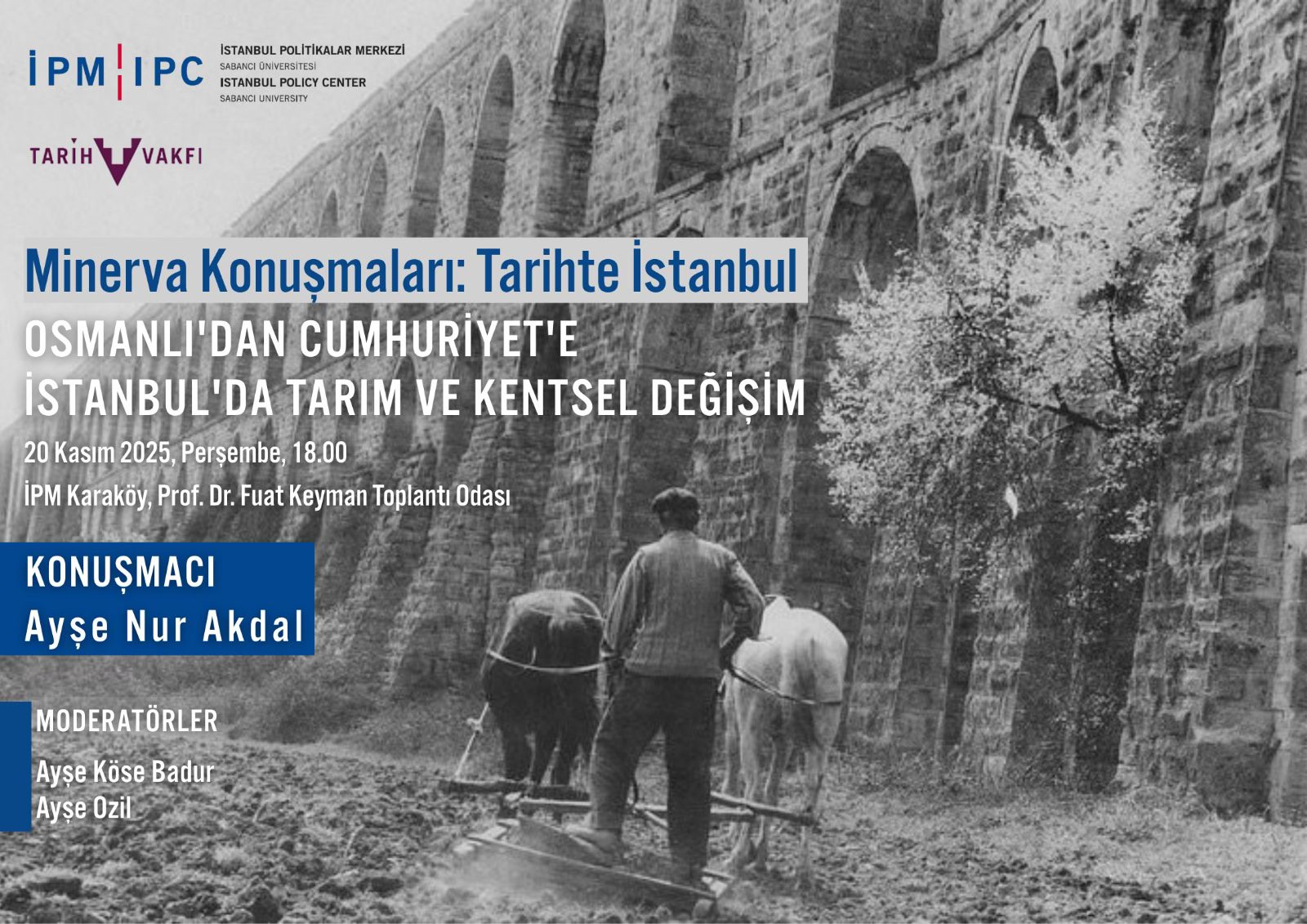Tarih Vakfı ve İPM iş birliğiyle düzenlenen ''Minerva Konuşmaları: Tarihte İstanbul'' serisinde, Ayşe Köse Badur ve Ayşe Ozil moderatörlüğünde ''Minerva Konuşmaları: Tarihte İstanbul - Osmanlı'dan Cumhuriyet'e Tarım ve Kentsel Değişim'' başlıklı konuşmasıyla Ayşe Nur Akdal'ı ağırlıyoruz. 20 Kasım 2025, Perşembe 18:00 Prof. Dr. Fuat Keyman Toplantı Odası, İPM Karaköy Çevrim içi katılım: https://bit.ly/43n4BmC Fiziksel katılım: https://bit.ly/3JF6q7H