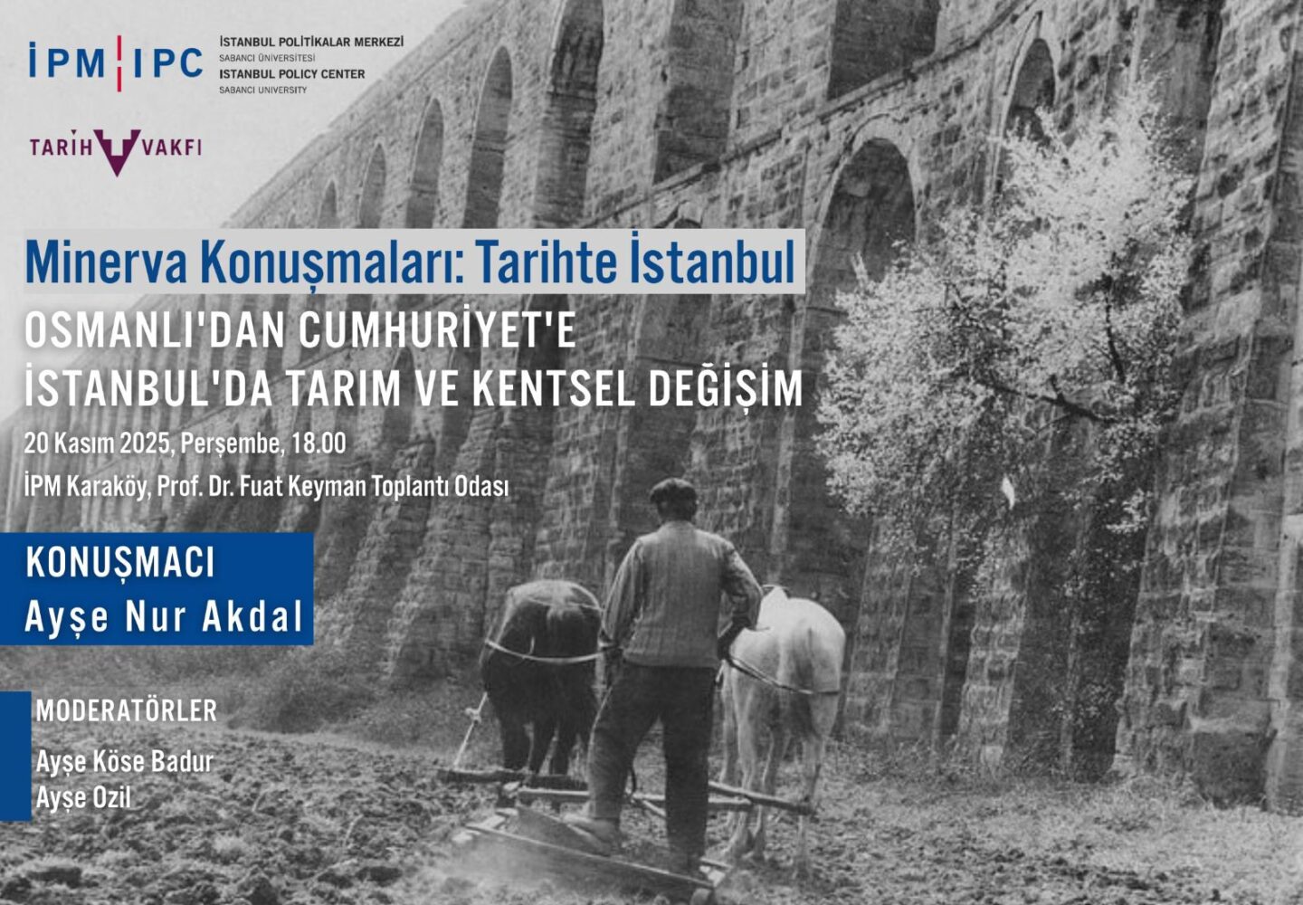 Tarih Vakfı ve İPM iş birliğiyle düzenlenen ”Minerva Konuşmaları: Tarihte İstanbul” serisinde, Ayşe Köse Badur ve Ayşe Ozil moderatörlüğünde ”Minerva Konuşmaları: Tarihte İstanbul – Osmanlı’dan Cumhuriyet’e Tarım ve Kentsel Değişim” başlıklı konuşmasıyla Ayşe Nur Akdal’ı ağırlıyoruz. 20 Kasım 2025, Perşembe 18:00 Prof. Dr. Fuat Keyman Toplantı Odası, İPM Karaköy Çevrim içi katılım: https://bit.ly/43n4BmC Fiziksel...