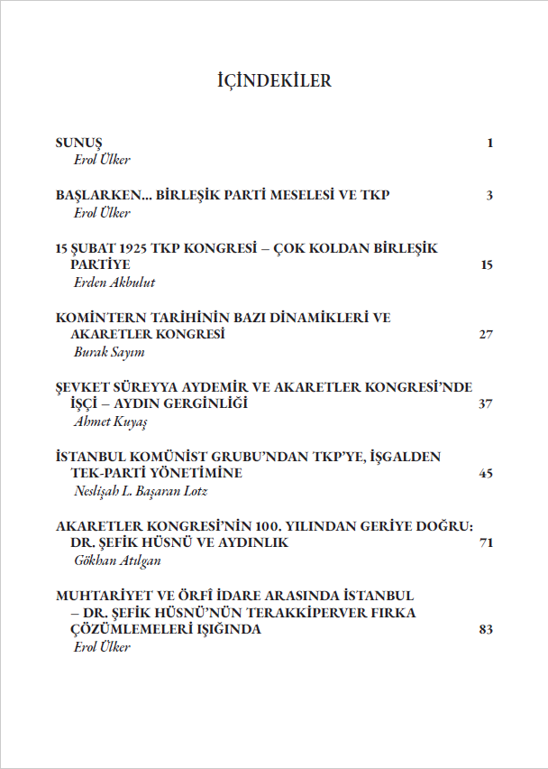 Elinizdeki derlemenin ortaya çıkışına vesile olan başlıca gelişme, 15 Şubat 1925’te toplanan Akaretler Kongresi’dir. Farklı devrimci ve komünist öbeklerden geldiği halde bu kongreye katılan nispeten genç bir topluluk, Komintern Dördüncü Kongresi’nde alınan kararlar doğrultusunda hareket etmektedir. Bu doğrultuda Türkiye’deki farklı komünist çevrelerin tek bir parti çatısı altında bir araya gelmesi gibi mühim bir karar alırlar. Böylece TKP, kuruluş sürecinin en önemli aşamalarından birini geride bırakır ve Cumhuriyet tarihinin en köklü, Türkiye’de emek mücadeleleri ve sol hareketlerin en etkili siyasal aktörlerinden biri olarak ortaya çıkar. Bu ortak çalışma, yalnızca bölünme ve ayrışmaların değil çoğulculuğun ve birlikte mücadele geleneğinin de Türkiye’de komünist hareketin kuruluşuna içkin güçlü bir eğilimi temsil ettiğini hatırlatıyor.