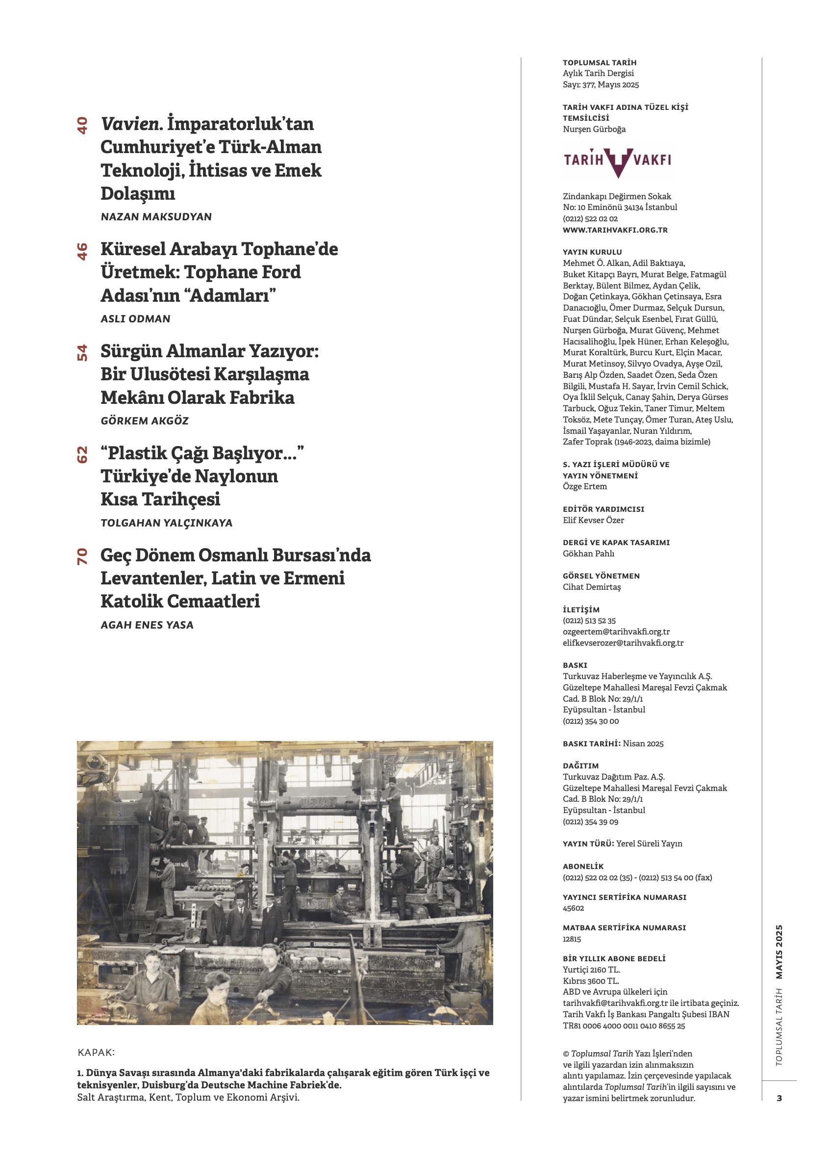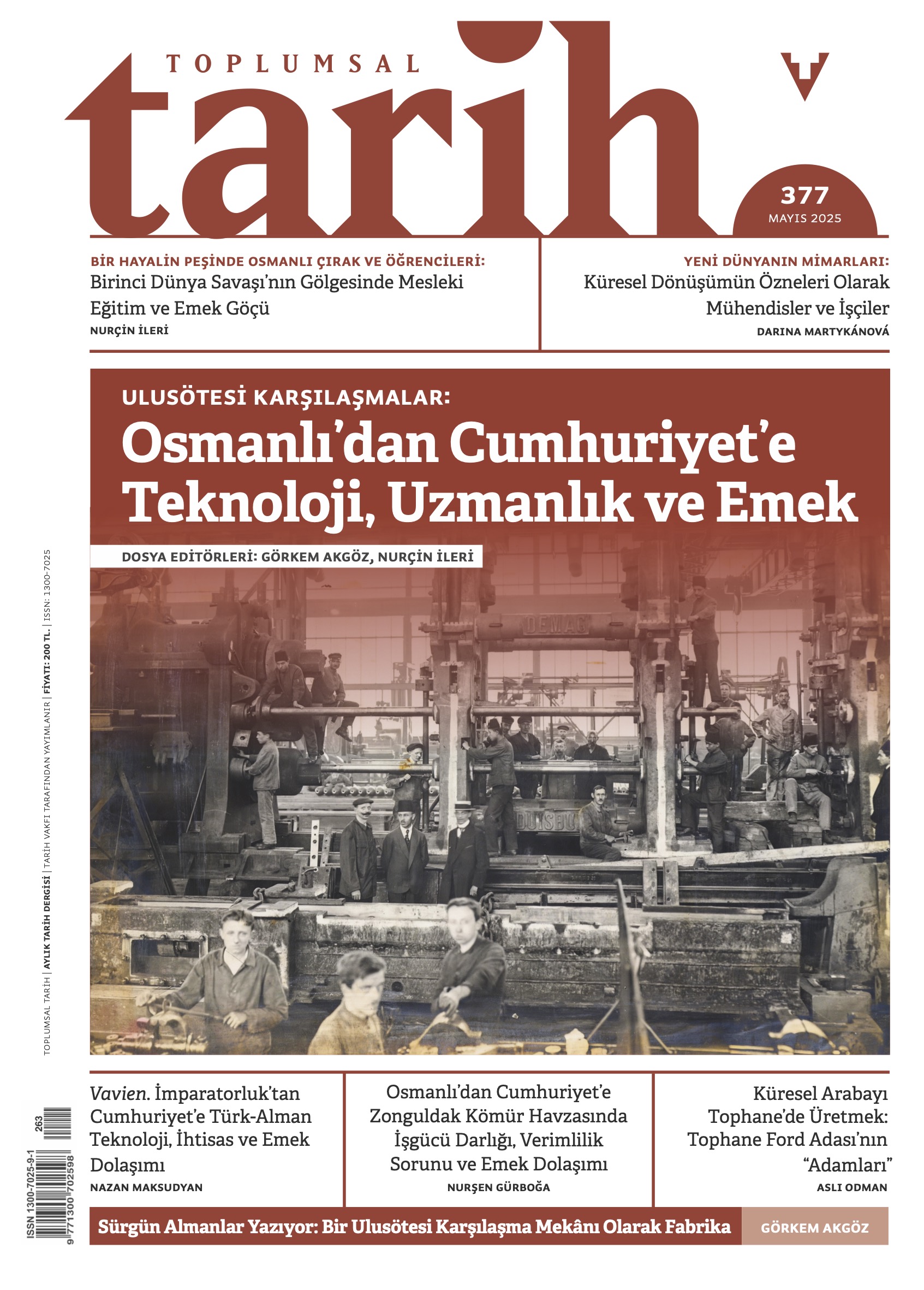 Darina Martykánová küresel teknolojik bağlamda eğitim ve kariyer meselesine, Nurşen Gürboğa Zonguldak’ta mühendis, teknik uzman ve işçi ilişkilerine bakıyor. Nurçin İleri I. Dünya Savaşı sırasında Osmanlı’dan Almanya’ya gönderilen çırak ve öğrencilerin, Nazan Maksudyan Almanya’da çıraklık eğitimi alan Dağlı kardeşlerin peşinden gidiyor. Aslı Odman, Tophane’deki Ford Motor Company’nin “millileşme” sürecini fabrikanın küresel yönetici ve ara kademe aktörleri açısından incelerken, Görkem Akgöz merceği Sümerbank’a ve oradaki dört Alman mühendise çeviriyor ve çok katmanlı bir endüstriyel işyeri tarihi okuması sunuyor. Dosya dışı yazılarda, Tolgahan Yalçınkaya, endüstriyel bir ürün olarak naylonun Türkiye’ye girişini, küresel ve yerel piyasalardaki karşılığını ve Türkiye’de algılanışını inceliyor. Agah Enes Yasa geç dönem Osmanlı Bursası’nda Levanten, Latin ve Ermeni Katolik cemaatlerinin izini sürüyor.⠀
