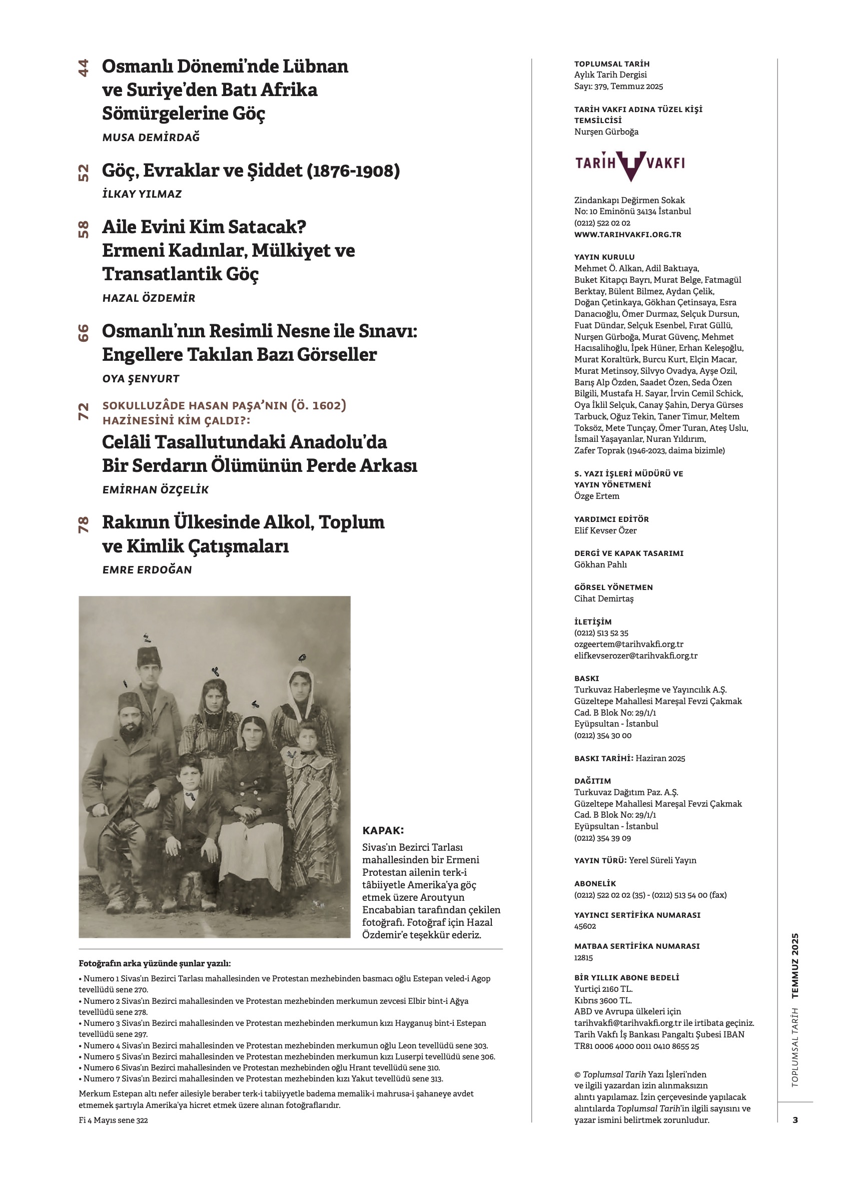 “Aile Evini Kim Satacak? Ermeni Kadınlar, Mülkiyet ve Transatlantik Göç” yazısında ise Hazal Özdemir özellikle Amerika’ya göç eden Ermeni kadınlar üzerinden “terk-i tâbiiyet” meselesine, kadınların⠀