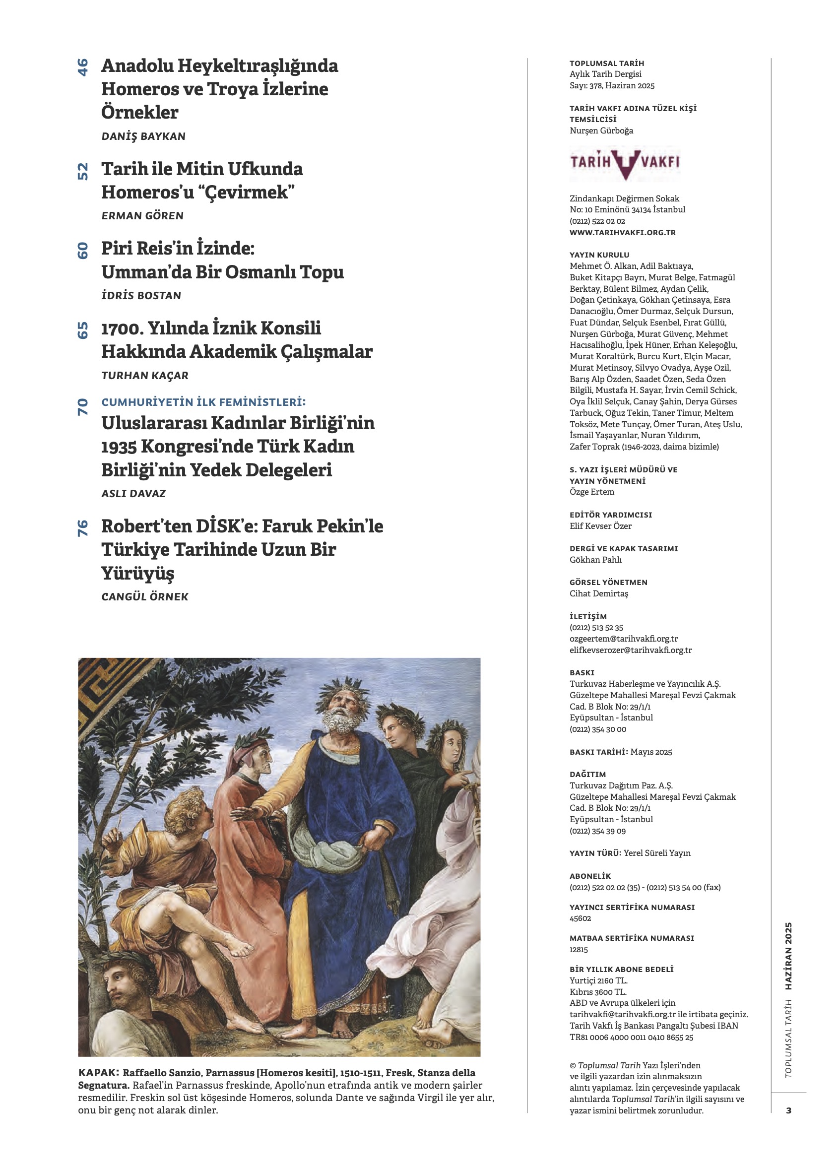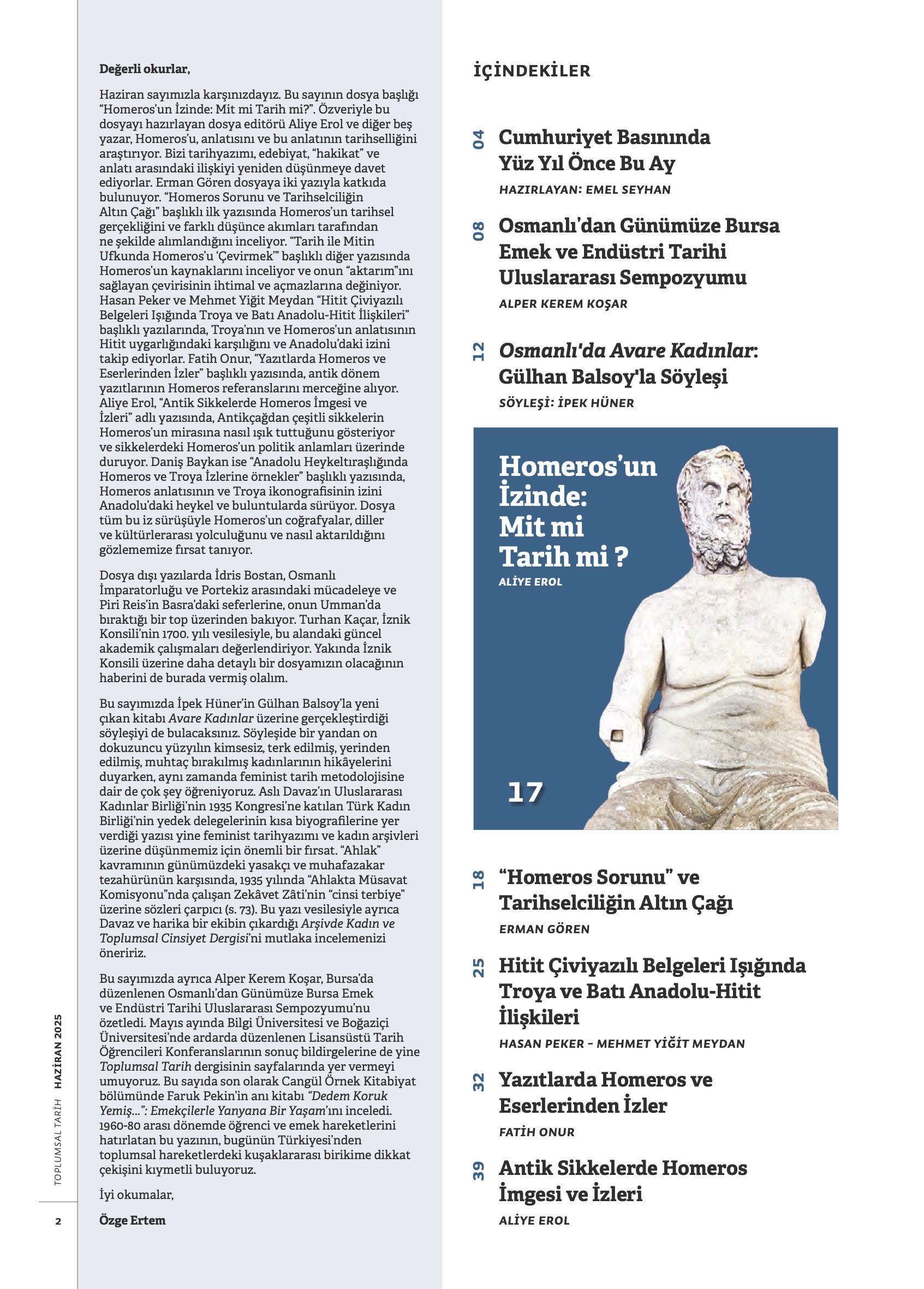 Dosya dışı makalelerden ilkinde Doğukan Bozkurt Genç Osman’ın katli meselesine, Burak Yüksel de cumhuriyet dönemindeki Türkleştirme politikaları bağlamında Hatay’daki Nusayri toplumuna bakıyor. Kitabiyat bölümünde Nuray Mert Hasan Kayalı’nın Direnen İmparatorluk kitabını inceliyor. Haziran’da İstanbul’da Koç Üniversitesi ANAMED’de düzenlenen Shifa-Ana çalıştayının ve Amasya’da gerçekleştirilen 1. Uluslararası Amasyalı Strabon Sempozyumu’nun değerlendirme ve özetlerini sırasıyla Alper Kerem Koşar ve Mustafa Hamdi Sayar’ın kaleminden okuyabilirsiniz.