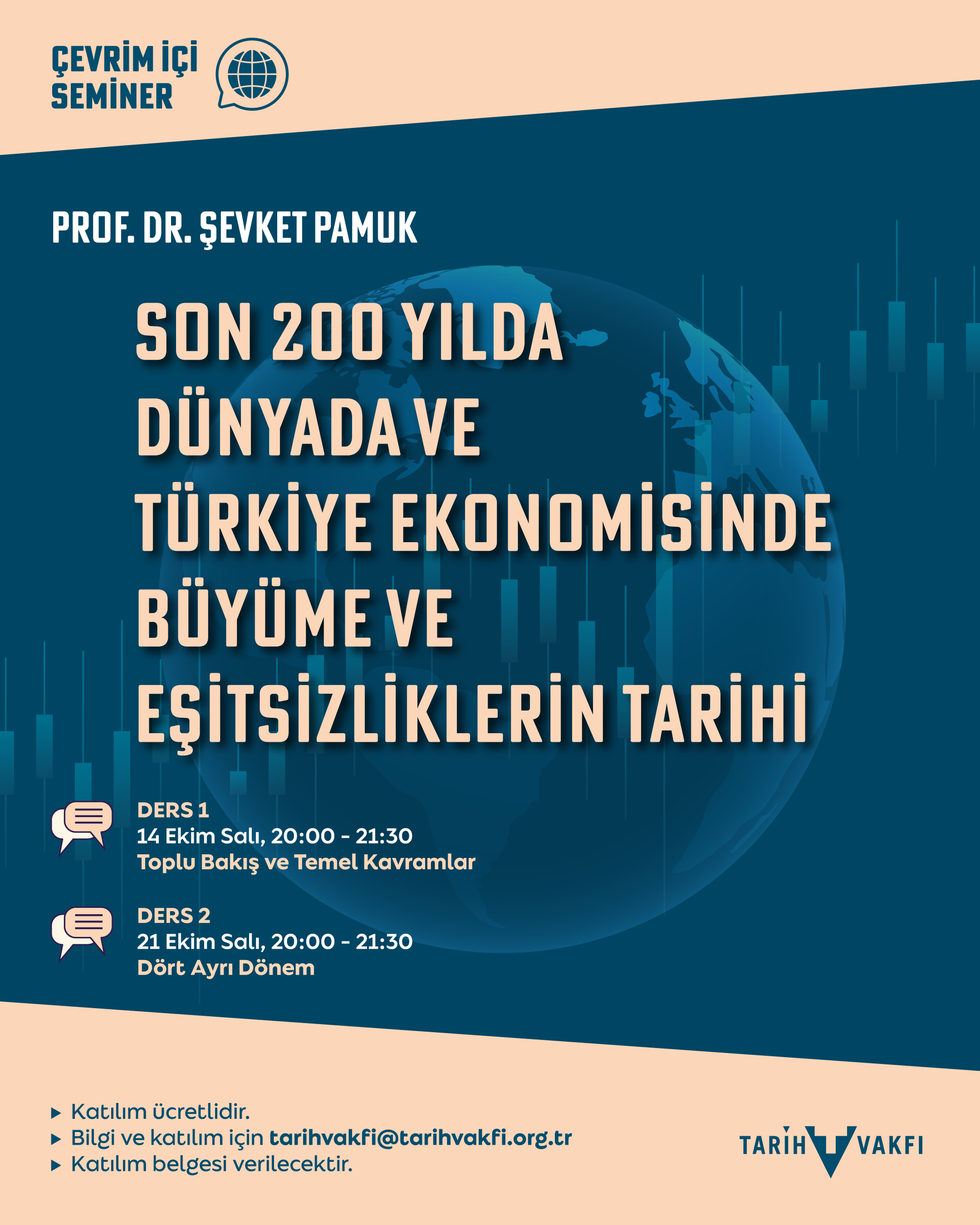 Güz döneminde çevrimiçi seminerlerimize Prof. Dr. Şevket Pamuk'un "Son 200 Yılda Dünyada ve Türkiye Ekonomisinde Büyüme ve Eşitsizliklerin Tarihi" başlıklı semineriyle başlıyoruz. 14 ve 21 Ekim tarihlerinde iki seansta gerçekleşecek bu ücretli seminere buradan kayıt olabilirsiniz.