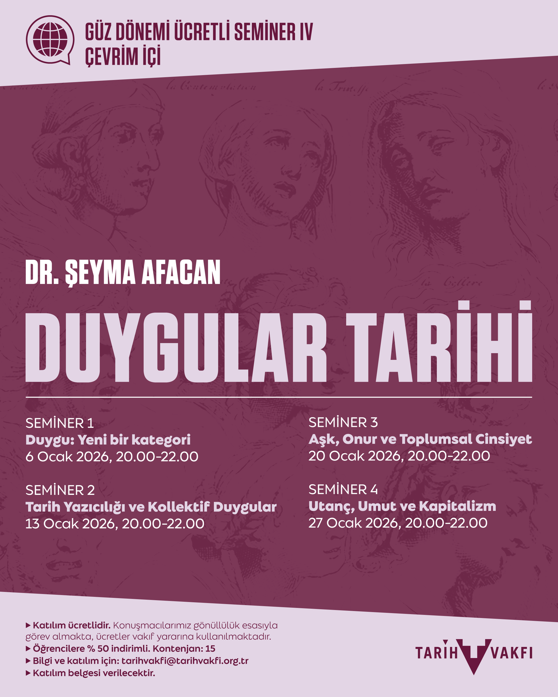 Tarih Vakfı Güz dönemi ücretli seminerleri Şeyma Afacan'ın dört derslik semineri ile devam ediyor. Ocak ayında çevrimiçi olarak gerçekleşecek seminere kayıt için tıklayınız.