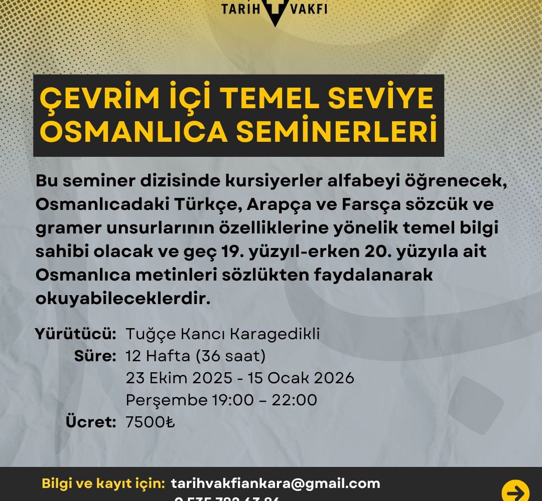 Yürütücü: Tuğçe Kancı Karagedikli Süre: 12 Hafta Tarih: 23 Ekim 2025 – 15 Ocak 2026 Perşembe 19:00 – 22:00 Toplam Ücret: 7500 TL Kontenjan: 25 Öğrencilere %50 İndirimli Kontenjan: 5 ([email protected] adresine e-posta ile başvurulması gerekmektedir) Kayıt Linki: https://fonzip.com/tarihvakfi/etkinlikler/2-cevrim-ici-temel-seviye-osmanlica-seminerleri