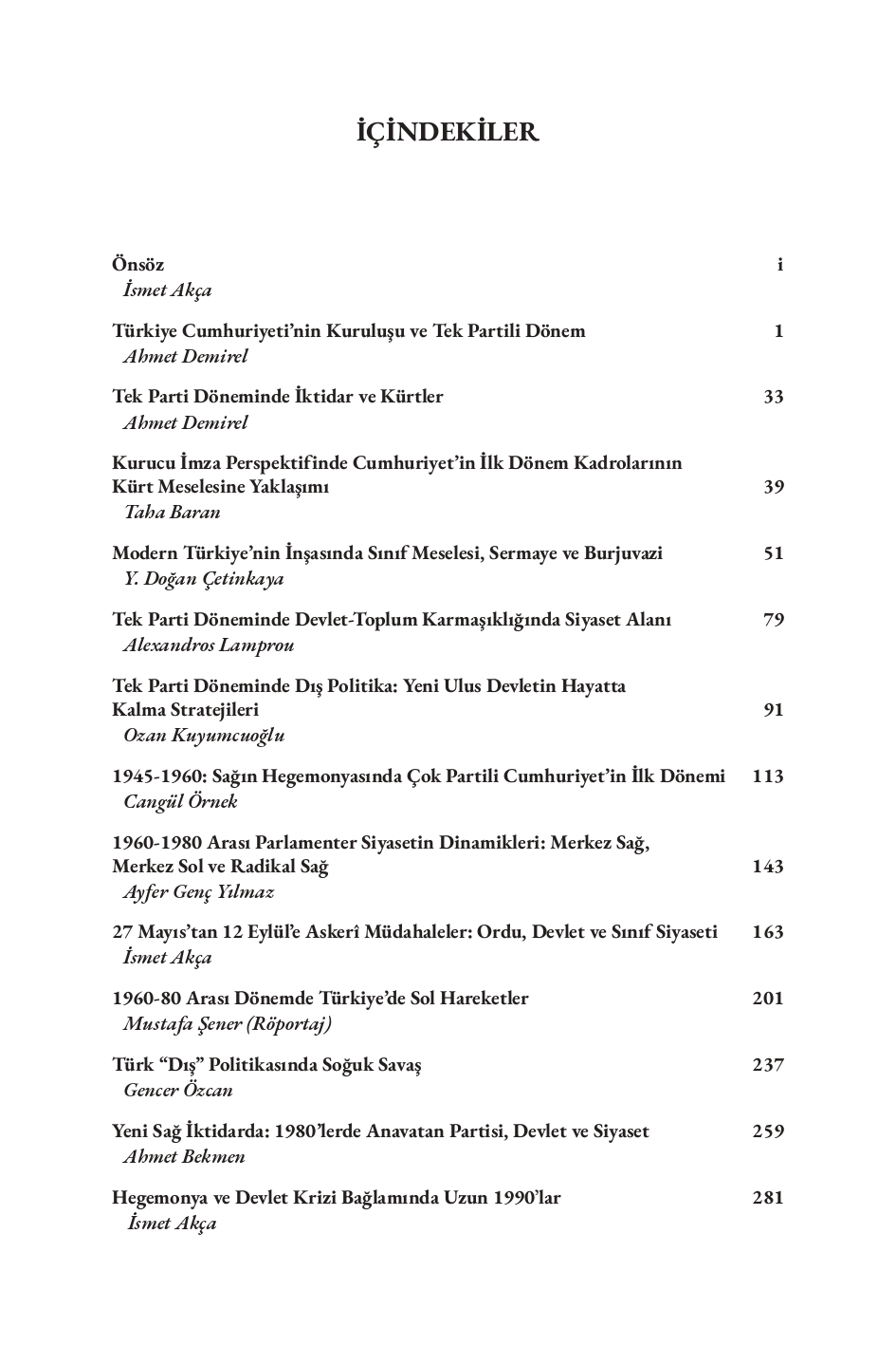 Cumhuriyet’in 100 yılı aşan siyasi tarihinin alt dönemlerine, dinamiklerine ve meselelerine odaklanarak bir bilançosunu çıkarmaya çalışan elinizdeki derleme, hem 1990’lardaki eleştirel birikimden faydalanıyor hem de esas olarak akademik sosyal bilimler literatüründeki bu yeni kuşak çalışmalar çerçevesinden bakıyor bu söz konusu tarihe.