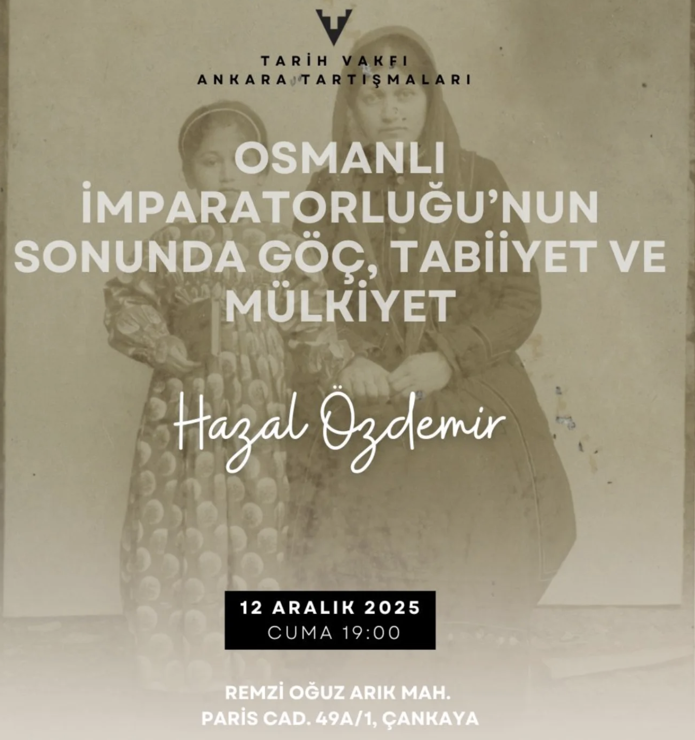 12 Aralık'ta Hazal Özdemir'in ““Osmanlı İmparatorluğu'nun Sonunda Göç, Tabiiyet ve Mülkiyet" başlıklı konuşmasıyla Ankaralılarla buluştu.