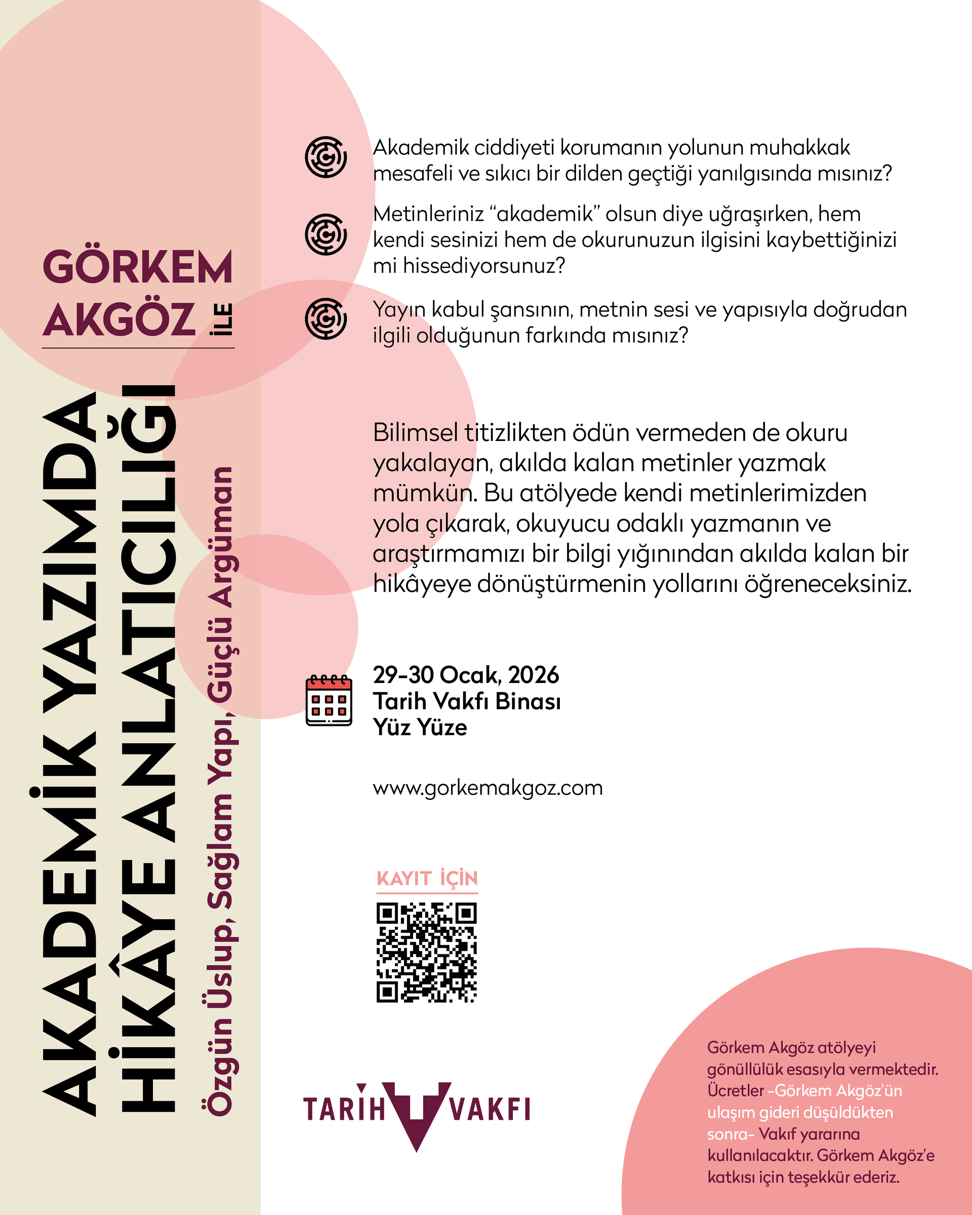 Görkem Akgöz tarafından Tarih Vakfı Eminönü binasında yüz yüze düzenlenecek olan atölyede okuyucu odaklı yazmanın ve araştırmamızı bir bilgi yığınından akılda kalan bir hikayeye dönüştürmenin yolları irdelenecek.